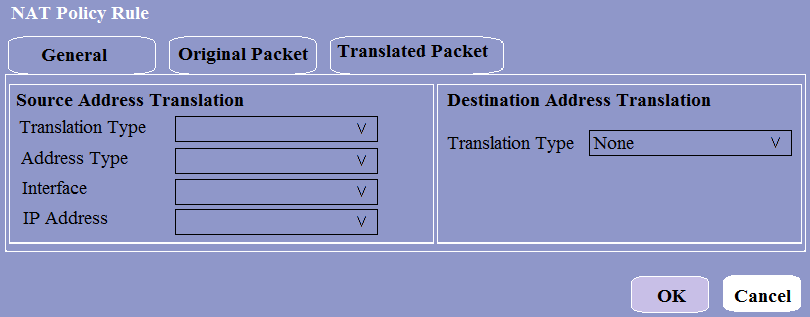 When creating a Source NAT policy, which entry in the Translated Packet tab will display the options Dynamic IP and Port, Dynamic, Static IP, and None?