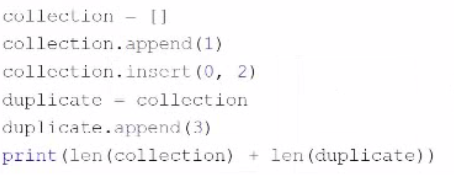 collection = [] collection.append(1) collection.insert(0, 2) duplicate = collection duplicate.append(3) print(len(collection) + len(duplicate))