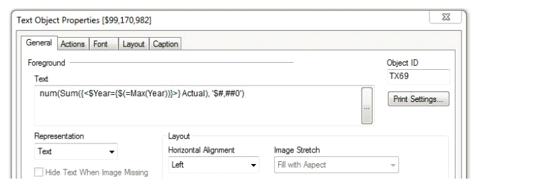 A business analyst needs to present the actual sales of the current year in a KPI on a dashboard. The expression in the Text field is NOT working