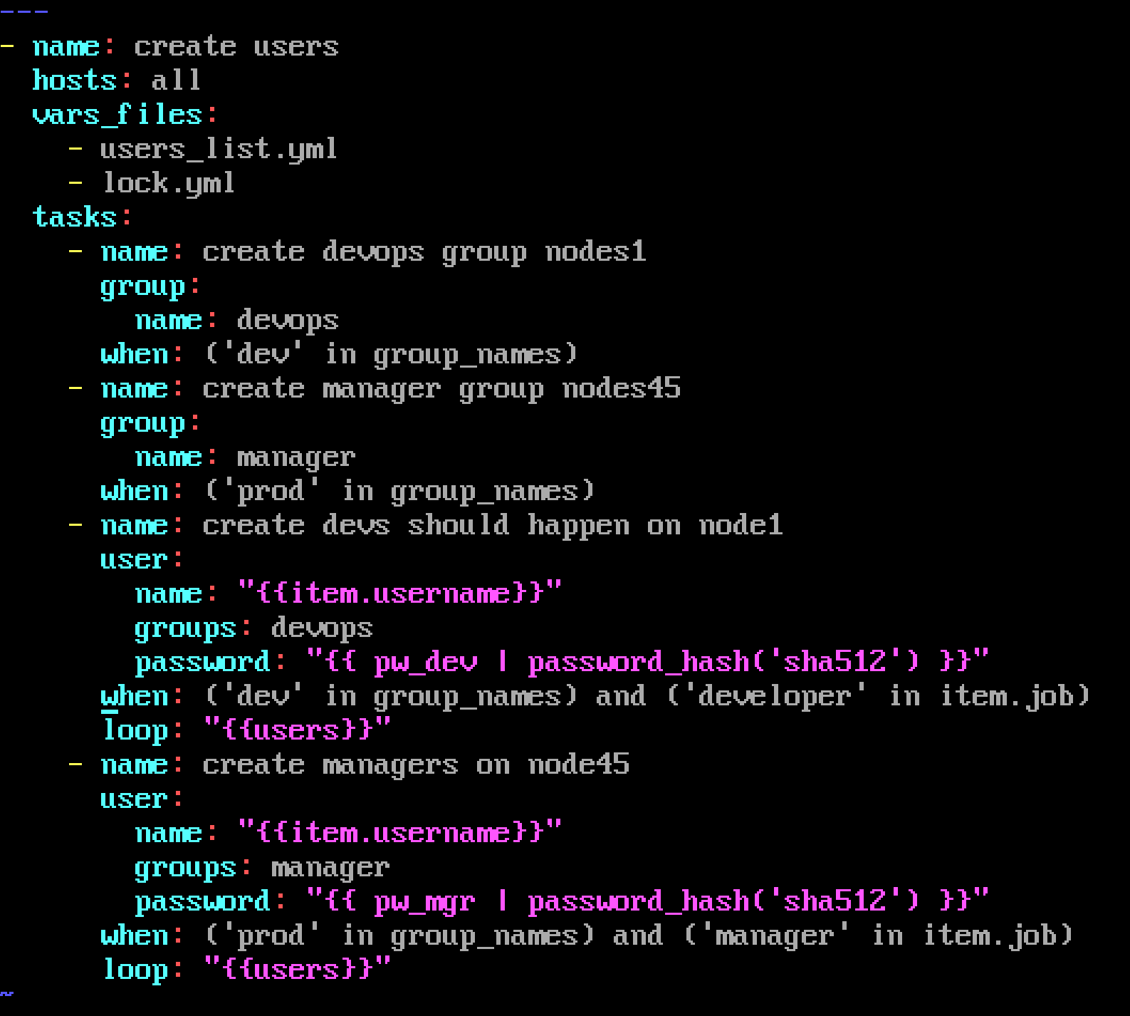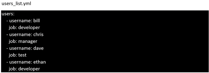 Create the users in the file usersjist.yml file provided. Do this in a playbook called users.yml located at /home/sandy/ansible. The passwords for these users should be set using the lock.yml file from TASK7. When running the playbook, the lock.yml file should be unlocked with secret.txt file from TASK 7.