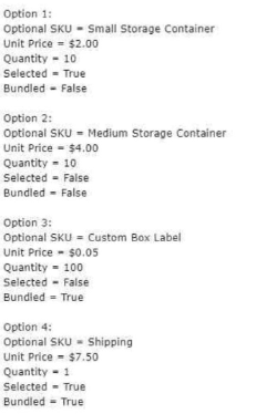 An admin has created a Small Business Bundle product with List Price = $5.00 with these Product Options: