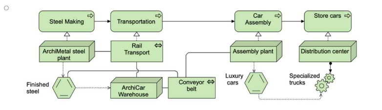 The relationships between processes (e.g., steel making, transportation, car assembly, and storage) must be clear and follow the logical flow of operations.