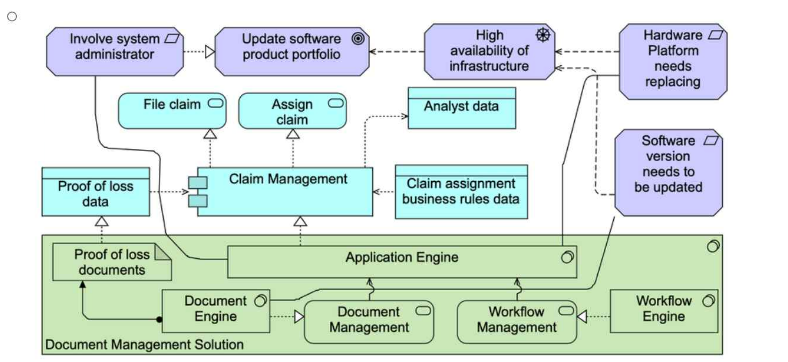 In this scenario, the focus is on modeling the ArchiSurance Mobile solution, showing the applications that make up this solution and the technology infrastructure that supports them. This includes applications, application services, and the system software environments (technology services) upon which the applications rely.