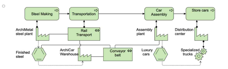 In this scenario, the task is to model the end-to-end technology processes at ArchiCar, showing how raw materials (finished steel) are processed through the company's manufacturing, transportation, and distribution system, ultimately resulting in fully assembled cars ready for delivery.