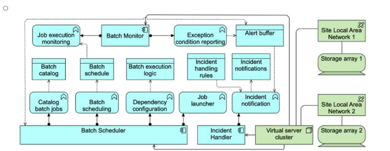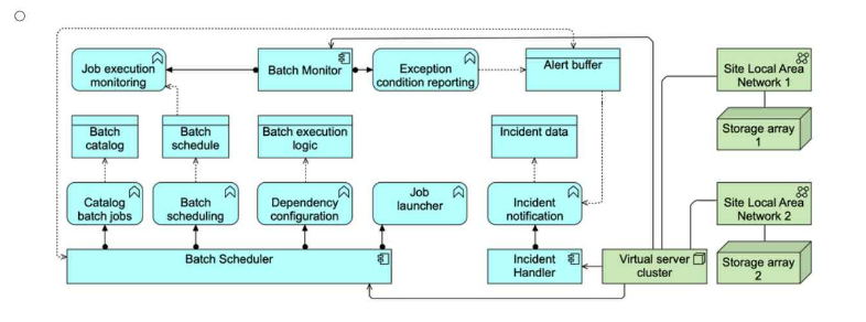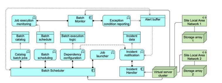 The relationships between components are modeled using ArchiMate 3 standards, such as flow relationships between the Batch Monitor and Alert Buffer or between the Incident Handler and storage components.