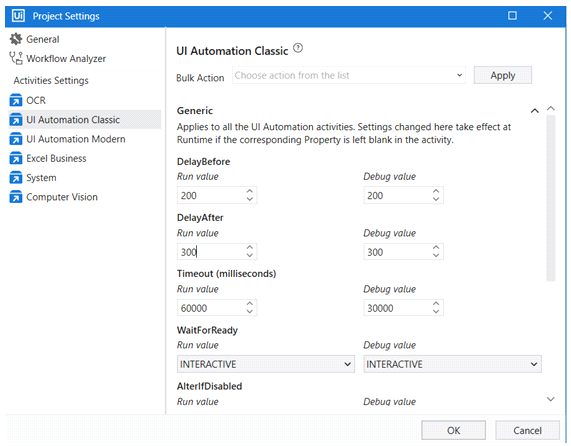 Settings changed in Project Settings take effect if the corresponding property is left blank in the activity. If in the same project an activity has the Timeout property manually set (even if the value 30000 milliseconds is the same as the default one), then the value set in the property panel overwrites any other value configured in the Activity Project Settings window.