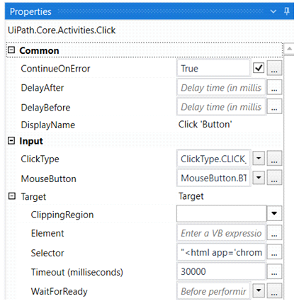 Please find the properties of the Click activity below.
