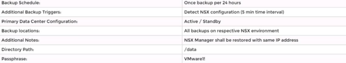 You have been asked to configure the NSX backups for the environment so that if the NSX Manager fails it can be restored with the same IP address to the original primary Data Center that is in an Active / Standby configuration. Backups should be scheduled to run once every 24 hours as well as when there are changes published to the NSX environment. Ensure that backups are completed on their respective environment. Verify the backup file has been created on the SFTP server.