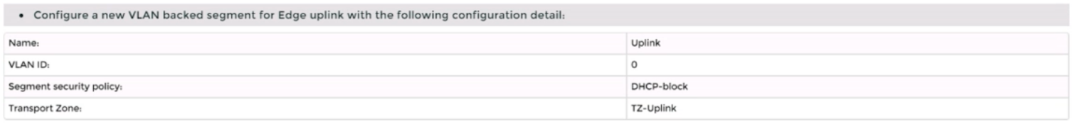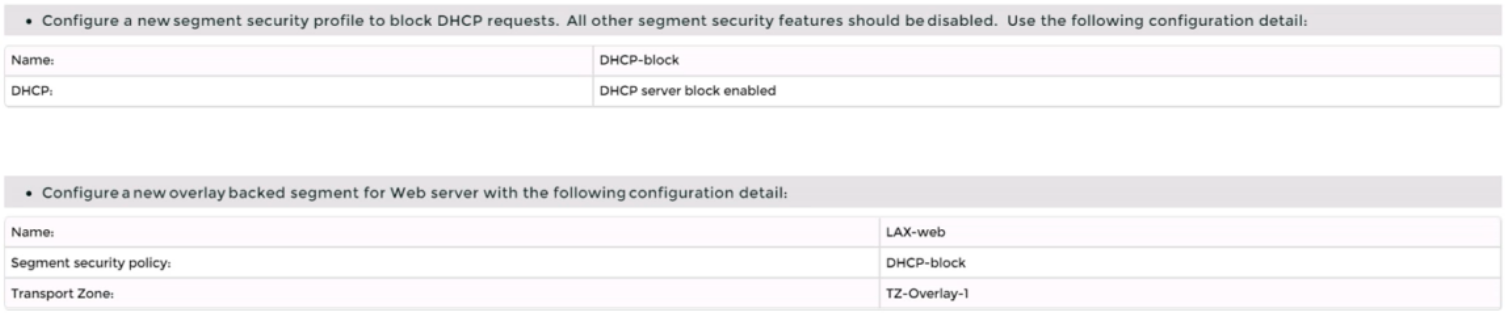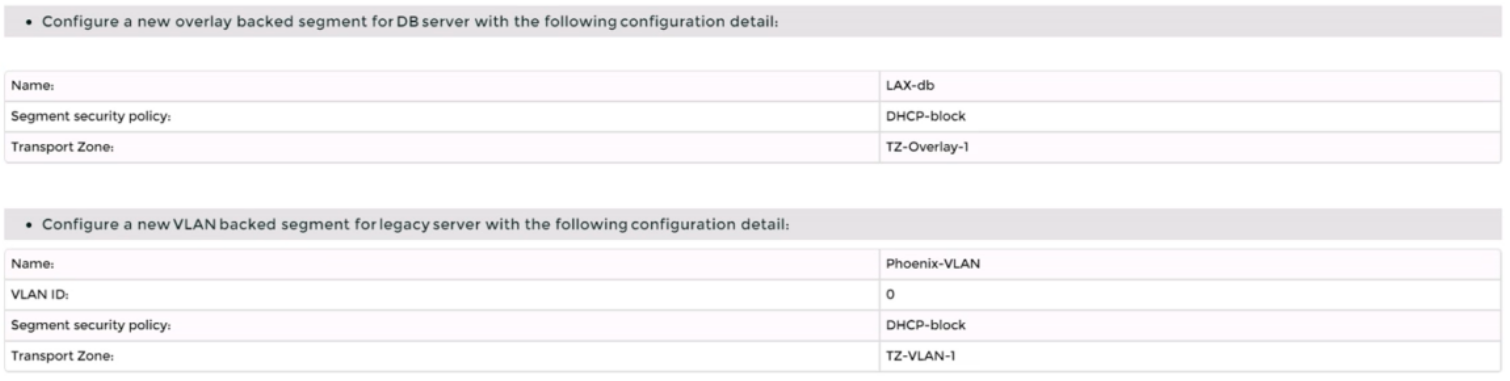 You are asked to deploy three Layer 2 overlay-backed segments to support a new 3-tier app and one Layer 2 VLAN-backed segment for support of a legacy application. The logical segments must block Server DHCP requests. Ensure three new overlay-backed segments and one new VLAN-backed logical segment are deployed to the RegionA01-COPMOI compute cluster. All configuration should be done utilizing the NSX UI.