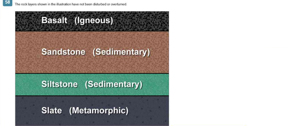 The given rock layers in the illustration show a sequence from bottom to top: slate (metamorphic), siltstone (sedimentary), sandstone (sedimentary), and basalt (igneous). This sequence indicates the following geologic history: