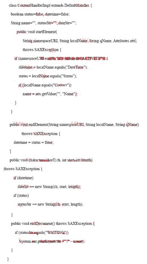 Push the Exhibit Button to load the referenced "XML Document". When processing the "XML Document" according to the method shown by "SAX Processing," which of the following correctly describes the output results (println method output)? Assume that the processed XML Document has no indents (ignorable white space such as line feeds, tabs, etc.). Although the expected processing result is choice "A", processing may not occur as expected. [SAX Processing] Use the following "ContentHandlerImpl" class, and parse the XML Document using SAX. The SAX parser is namespace aware. Assume no execution errors.