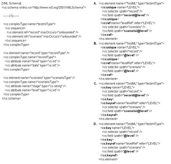 Assume that for [XML Document] referenced in a separate window, you wish to create an XML Schema document that defines that the value of the level attribute of the record element must be unique within the XML document, and further that the level attribute of the scenario element must reference the value of the level attribute of the record element.