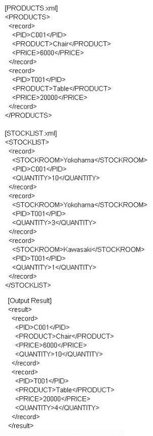 [PRODUCTS xml] (separate window) and [STOCKLIST.xml] (separate window) are output in XML format from RDB (relational database) data.